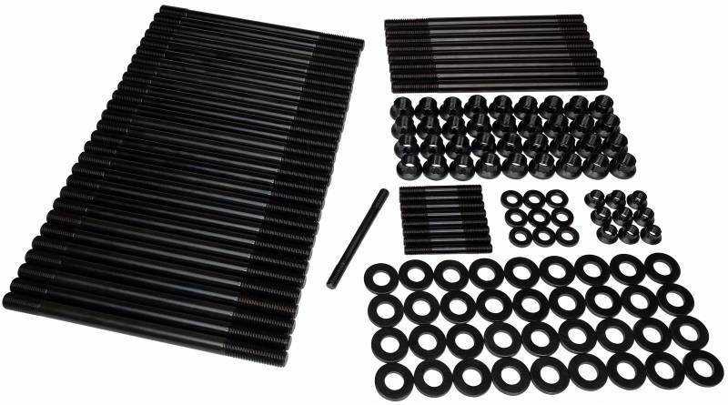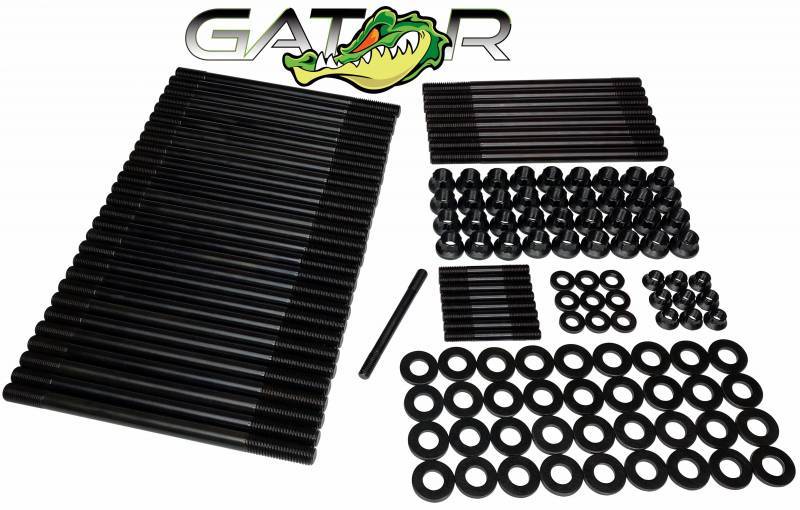 Each stud features precision-rolled threads after heat treatment, preserving grain structure for maximum fatigue resistance. The black oxide finish provides corrosion protection in harsh environments, while included 12-point chromoly nuts and Gator Juice assembly lube ensure accurate torque application and optimal clamp load retention during installation.